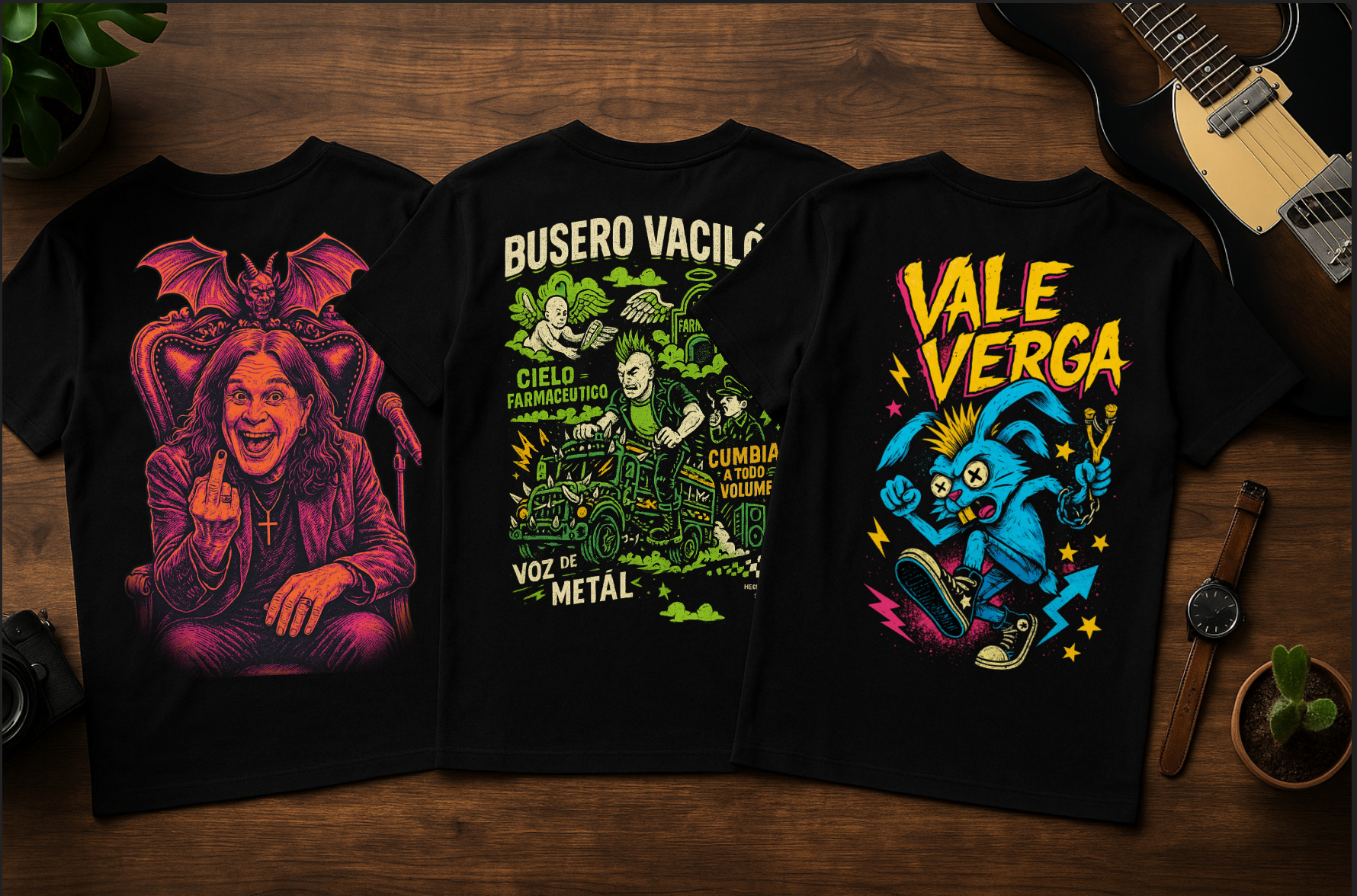 Nuestra merch acompaña la actitud: serigrafía local con textura vintage, algodón pesado, calce unisex y drops limitados que se agotan rápido. Cada prenda cuenta una historia de calle y escenario. Comprás estilo, te llevás una declaración: sin filtro, sin azúcar, sin miedo.