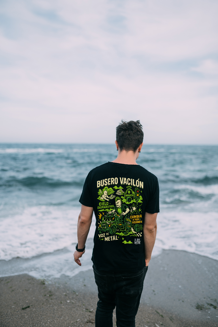 En la espalda: el busero en todo su flow, manejando la nave con estilo y ruido.