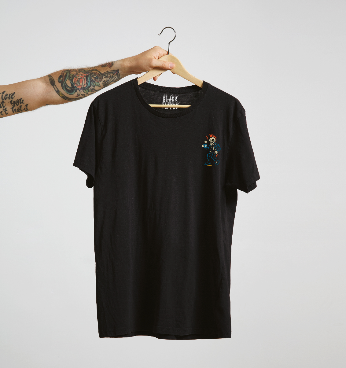 Maldita Vibra es nuestra oda al punk centroamericano. Un esqueleto con cresta roja camina con café en mano, flanqueado por torogoz, el Monumento al Divino Salvador del Mundo, ola, catedral y bus. Colores texturizados amarillo/azul/rojo con look vintage y DTF nítido que aguanta la trilla. Si tu mood es “no bajo el volumen”, esta es tu camiseta.